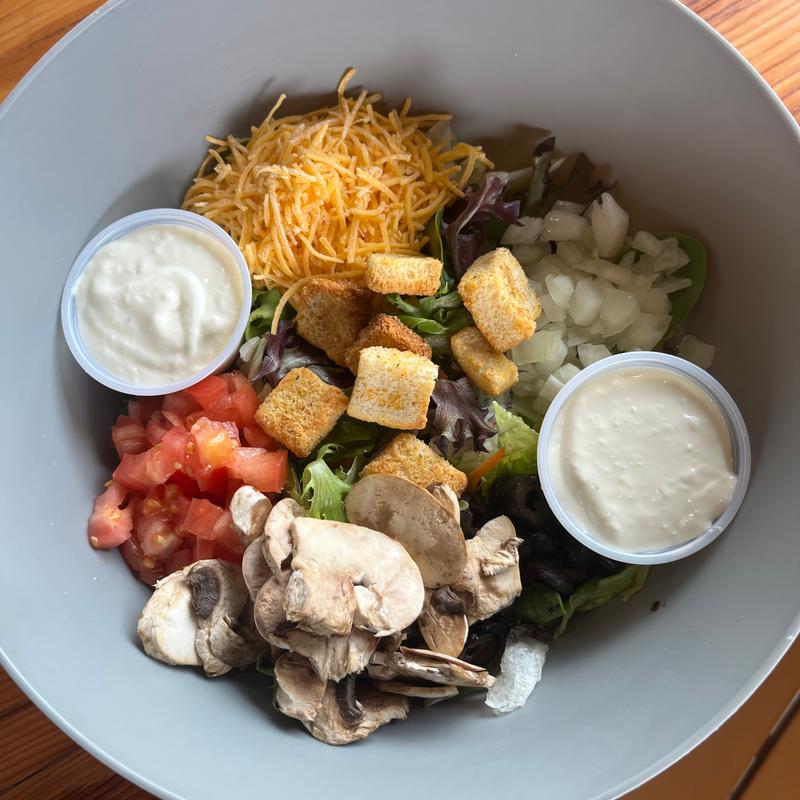 Add Grilled or Fried Chicken to your salad | Dressings: Ranch, Bleu Cheese, Balsamic Vinaigrette, French, Honey Mustard, Caesar, Italian.