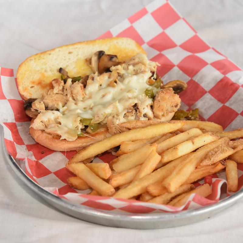 Waffle fries topped with your choice of Philly style cheesesteak, chicken Philly or BBQ Pork, with shredded mozzarella cheese, sauteed onions and peppers.